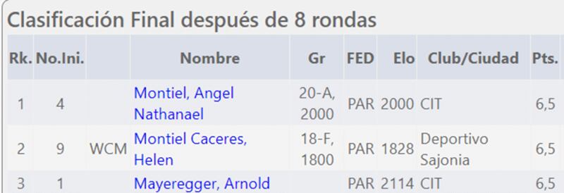 El campeón fue el nuevo CM Ángel Montiel, quien definió su victoria en la ultima partida, la vice campeona y a la vez mejor jugadora femenina fue la WCM Helen Montiel quien iba invicta hasta la penúltima ronda y el tercer puesto se lo llevo el MN Arnold Mayeregger quien hasta el momento es el mejor ubicado en la tabla de puntajes de los Grand Prix.