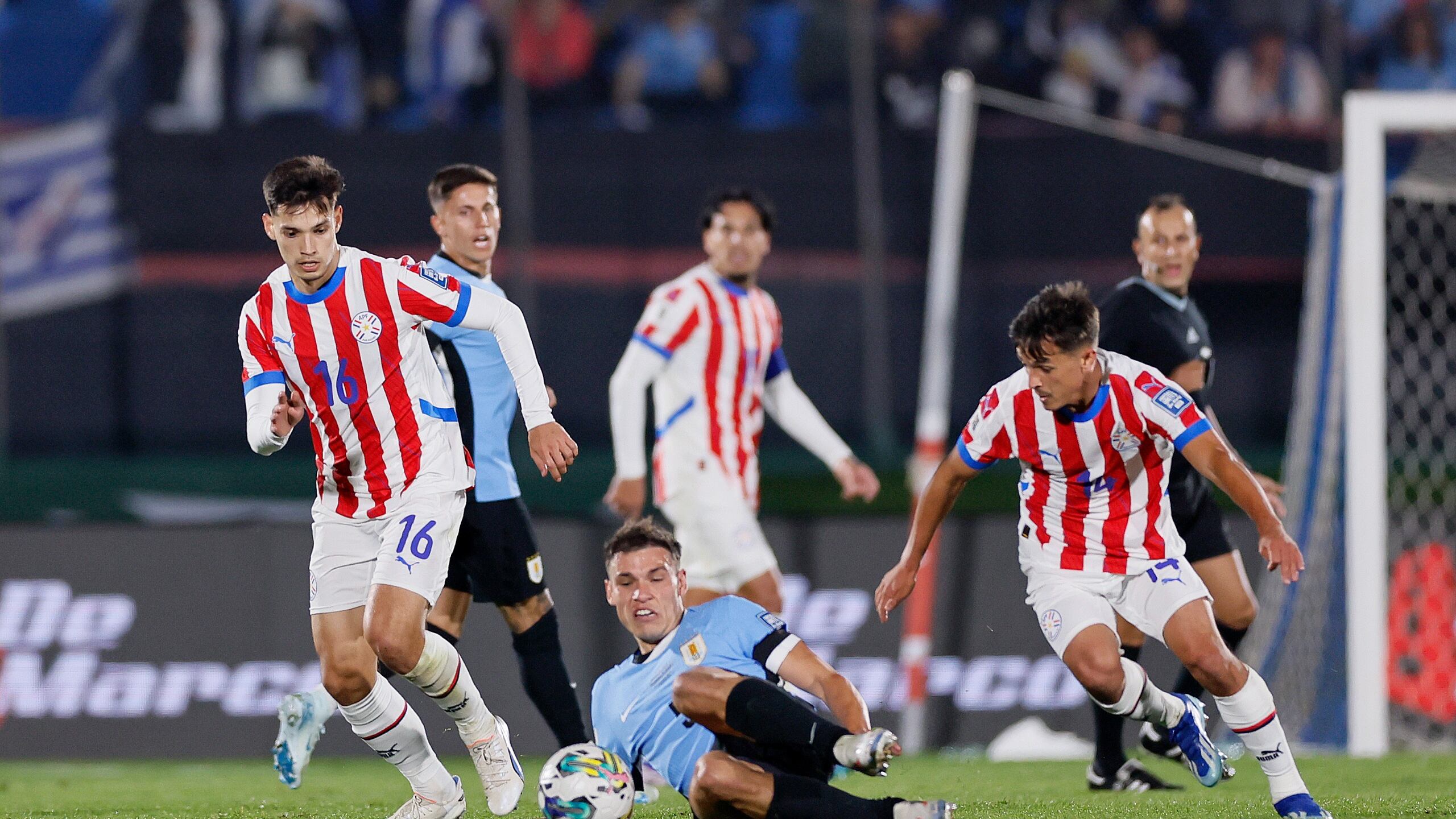 El partido comenzó con Paraguay bien parado con una línea defensiva bien sólida, el medio muy agresivo en la marca especialmente con Cubas impecable para recuperar balones; por los costados Enciso y Almirón con mucha velocidad pusieron en jaque a la defensa charrúa. Arriba, Pitta impuso mucha lucha ganando varias infracciones y creando preocupación a la retaguardia charrúa. El primer tiempo fue favorable a la albirroja que tuvo las mejores opciones: la primera fue un remate de Enciso que pega en la base del poste izquierdo de Rochet; la segunda acción fue iniciada por Cubas recuperando de gran forma un balón y asistiendo a Enciso que filtra un pase gol a Almirón cuyo remate encontró el cuerpo de Rochet; la tercera posibilidad fue tras un centro de Almirón que Gustavo Gómez desvía y Diego Gómez cabecea de forma débil a las manos del golero uruguayo. Frente a esto, la celeste inquietó en el minuto 8 cuando “Gatito” quiso salir jugando, la pelota pega en Pellistri, pero felizmente el balón volvió a las manos del golero; a los 18, tras un centro de Pellistri y resbalón de Cubas, Suárez remató por el poste salvándose la albirroja de forma milagrosa. Los primeros 45 minutos fueron muy friccionados y el equipo guaraní mereció ir a vestuarios con la victoria parcial.