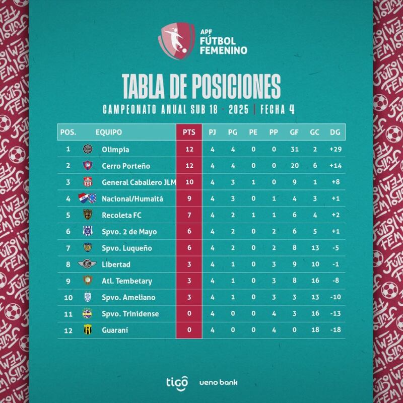 La cuarta jornada del Campeonato Anual tuvo su culminación el día domingo con el triunfo de Olimpia. Pero antes en el primer partido disputado ese día en el CARDIF, Atlético Tembetary y General Caballero de JLM igualaron 1 a 1. Ángeles Patiño había adelantado a las Rojiverdes en el primer tiempo, pero ya en el segundo periodo, la recién ingresada Shirley Portillo marcó el tanto dea igualdad para las esteñas.