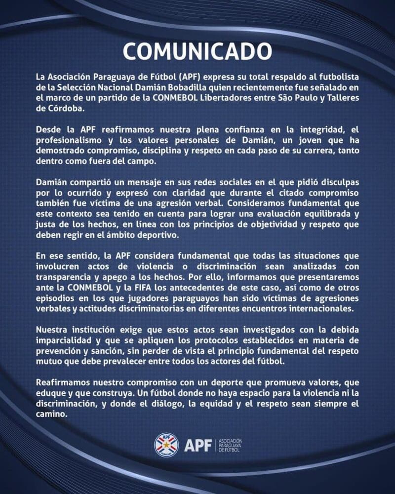 Ya en la noche de hoy, luego del video del propio Bobadilla, la Asociación Paraguaya de Fútbol (APF) sacó un comunicado expresando su total respaldo al jugador de la Albirroja.