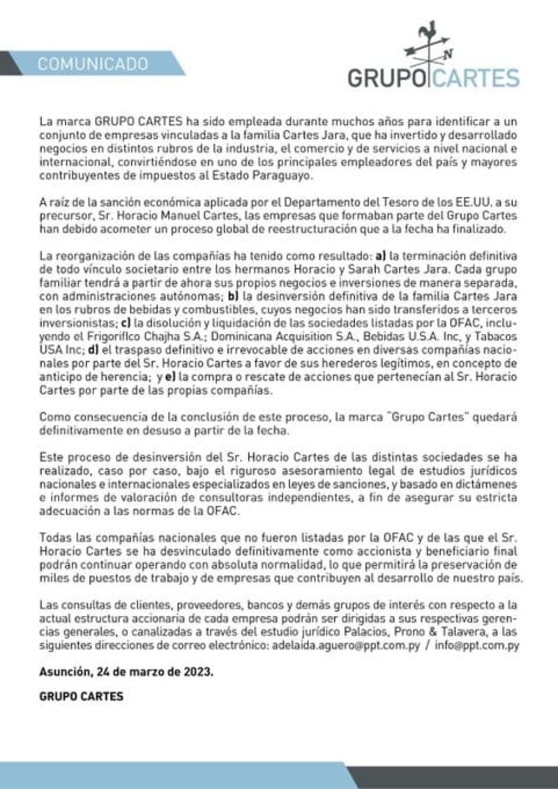 “La reorganización de las compañías ha tenido como resultado: a) la terminación definitiva de todo vínculo societario entre los hermanos Horacio y Sarah Cartes Jara. Cada grupo familiar tendrá a partir de ahora sus propios negocios e inversiones de manera separada, con administraciones autónomas; b) la desinversión definitiva de la familia Cartes Jara en los rubros de bebidas y combustibles, cuyos negocios han sido transferidos a terceros inversionistas; c) la disolución y liquidación de las sociedades listadas por la OFAC, incluyendo el Frigorífico Chajha S.A.; Dominicana Acquisition S.A., Bebidas U.S.A. Inc y Tabacos USA Inc.