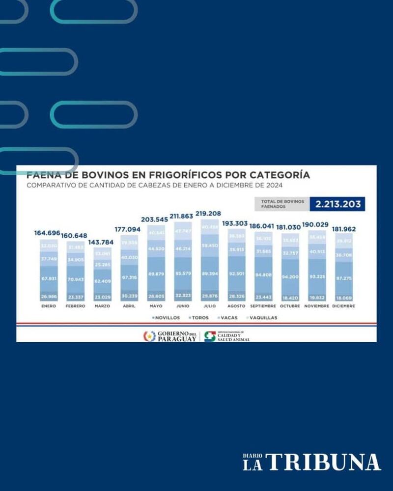 El crecimiento constante de los envíos de carne bovina fue notable desde 2021, cuando por primera vez se superaron los 300 millones de kilos anuales. En 2024, el principal mercado para la carne paraguaya fue Chile, país que adquirió más de 120 millones de kilos.