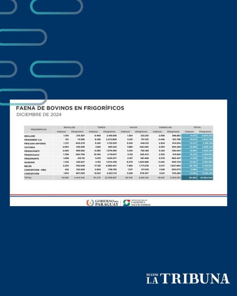 Además del récord en exportación de carne, Paraguay alcanzó una cifra histórica en la faena de bovinos, cerrando el año con 22.213.203 animales procesados, los frigoríficos con mayor volumen de faena fueron Belén, que procesó 36.759 cabezas, y Concepción, con 21.094 cabezas.