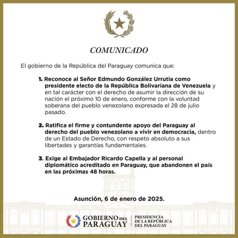 La Presidencia de la República del Paraguay divulgó un comunicado donde reconoce la victoria de Edmundo González y su derecho de asumir el poder el 10 de enero próximo.