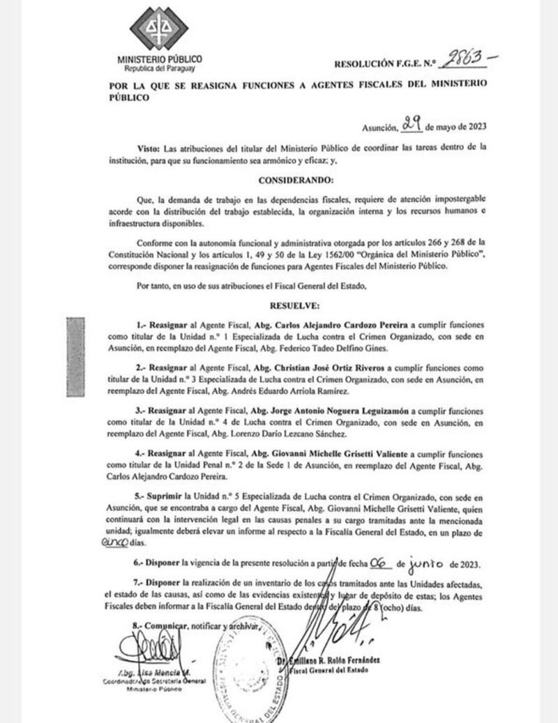 Queda suprimida una Unidad Especializada en Crimen Organizado, que estaba a cargo del fiscal Giovanni Grisetti. Los fiscales, Federico Delfino, Lorenzo Lezcano y Andrés Arriola quedan sin unidad por ahora, y Grisetti va a una unidad ordinaria, sede N° 1. La fiscal, Liliana Alcaraz, que estaba en la Fiscalia de Delitos Económicos y Anticorrupción, va a la Fiscalía Barrial N° 7.