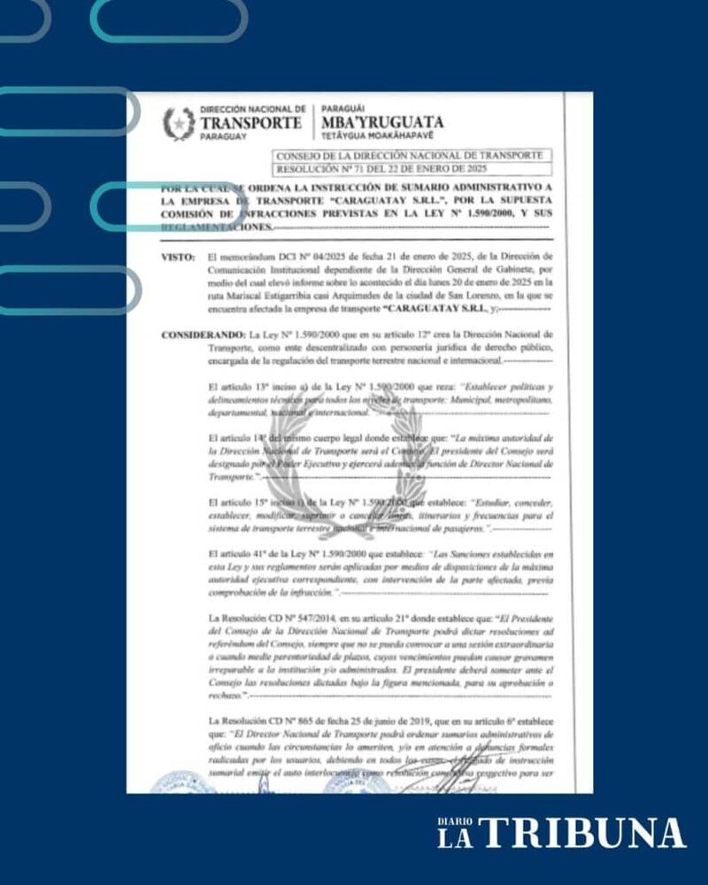 El transporte involucrado pertenece a la empresa Caraguatay S.A., cuya unidad tenía sus permisos en regla, según informó Luis Fernando González, director de la Dirección Nacional de Transporte (Dinatran).
