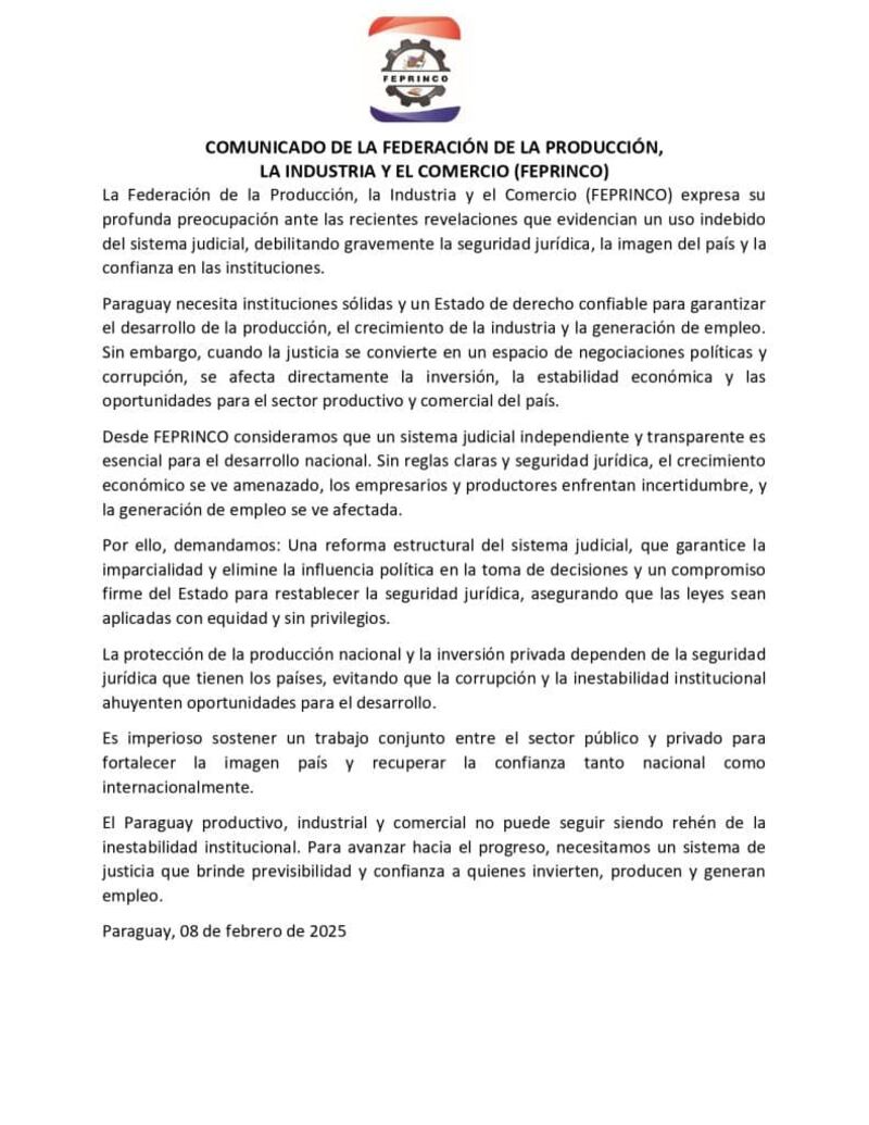 La Federación de la Producción, la Industria y el Comercio (FEPRINCO) expresó su profunda preocupación ante las recientes revelaciones sobre el uso indebido del sistema judicial, lo que debilita la seguridad jurídica, la confianza en las instituciones y la imagen del país.