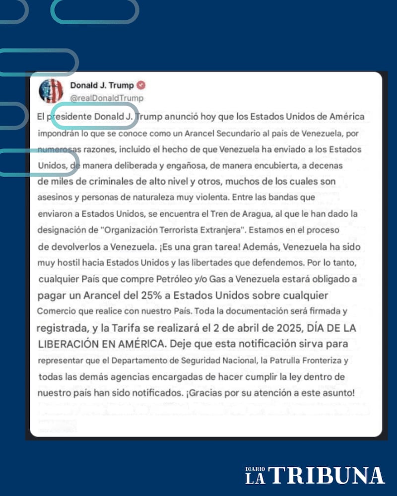 Hasta el momento, Trump anunció que la medida entrará en vigor a partir del 2 de abril, en un contexto de crecientes tensiones entre Estados Unidos y Venezuela.