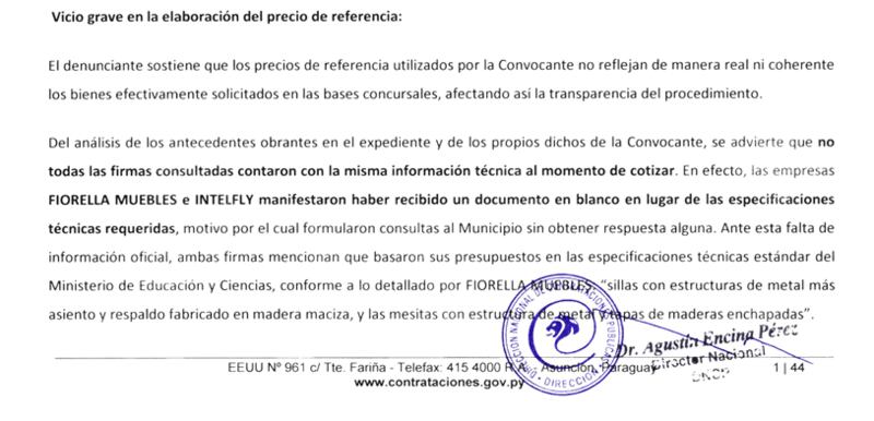 El informe final elaborado por la DNCP señala entre otras cosas que en el marco de la investigación se comprobó que la municipalidad de Ciudad del Este pidió cotización de empresas, enviándoles por correo electrónico supuestamente un archivo adjunto de especificaciones técnicas de pupitres, sin embargo, el mismo estaba vacío.