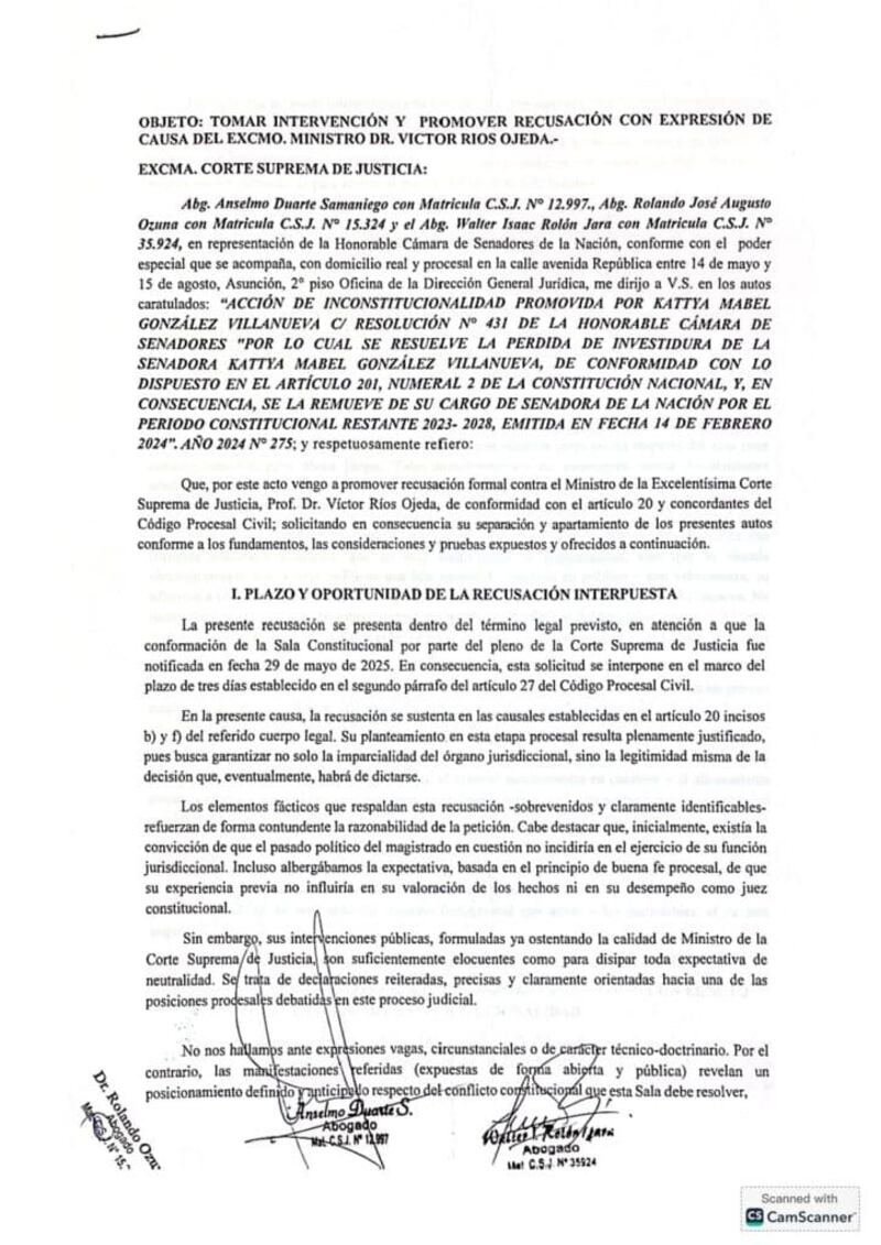 La Cámara de Senadores, recusó al ministro de la Corte Suprema de Justicia, Víctor Ríos y al camarista Esteban Kriskovich, solicitando que que se aparten del análisis de la acción de inconstitucionalidad presentada por la exsenadora Kattya González, quien busca revertir su destitución del Congreso.