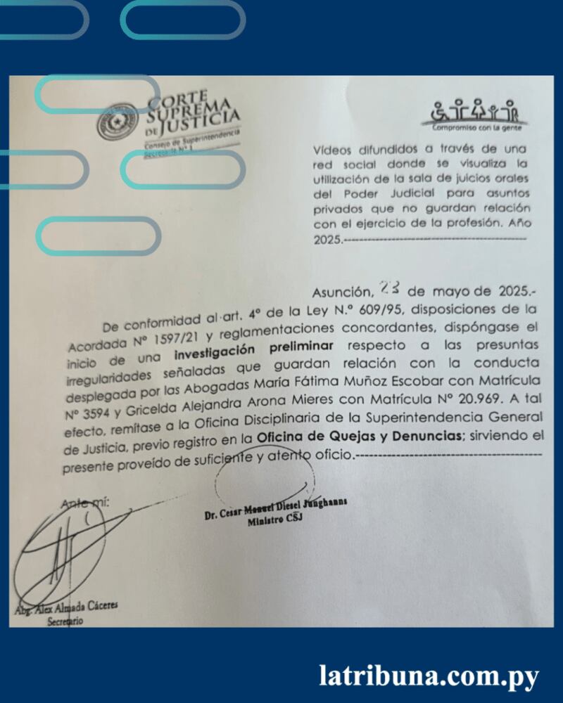 El secretario del Consejo de Superintendencia, Alex Almada, informó a la prensa que se analiza la conducta desplegada por la abogada en el contenido difundido. La normativa aplicable es la Acordada 1597 de la Corte Suprema de Justicia, que establece el marco de conducta para los actores del sistema judicial.
