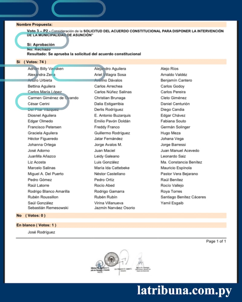 La Cámara de Diputados aprobó este miércoles la intervención de la gestión de Óscar Rodríguez al frente de la Municipalidad de Asunción. Con 74 votos a favor, el pleno aprobó el pedido de la Contraloría General de la República (CGR).