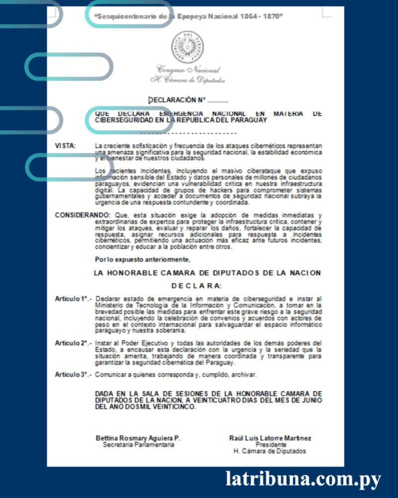 El artículo 1º del proyecto aprobado declara formalmente la emergencia nacional en ciberseguridad en todo el territorio paraguayo.