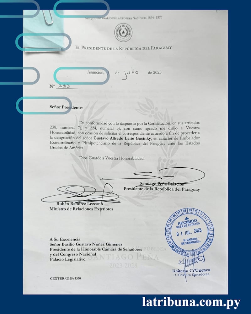 Tras finalizar su informe, confirmó también que la Cámara Alta recibió la nota oficial del Poder Ejecutivo solicitando el acuerdo constitucional para la designación de Gustavo Leite como embajador de la República del Paraguay ante los Estados Unidos.