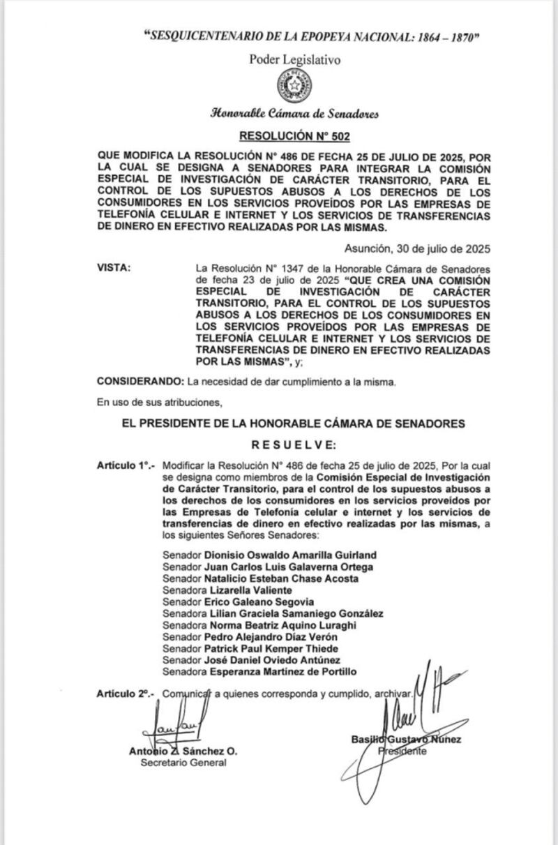 El Senado instaló la Comisión Especial de Investigación que revisará las denuncias contra empresas telefónicas y de internet que operan licenciadas en el país. El senador Dionisio Amarilla asumió la presidencia, mientras que la senadora Lilian Samaniego fue designada vicepresidenta y el senador Patrick Kemper como relator.