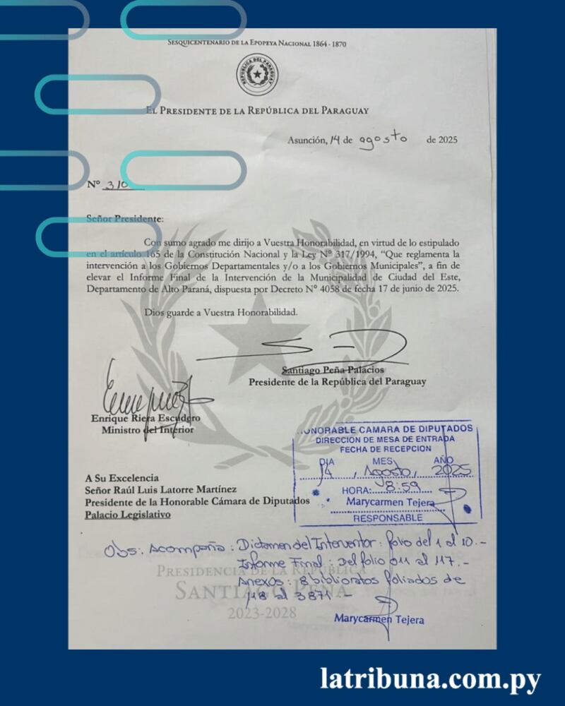 El interventor Ramón Ramírez entregó el informe el jueves 14 de agosto al ministro del Interior, Enrique Riera, quien confirmó su recepción y lo remitió al presidente de la República, Santiago Peña. Posteriormente, el documento fue enviado a la Cámara de Diputados para su estudio.