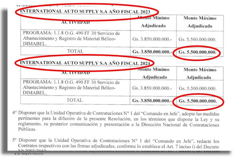 En el portal de la Dirección Nacional de Contrataciones Públicas, figura la empresa International Auto Supply S.A., con RUC 80038257-9 a nombre de Diego Hernán Dirisio, con una adjudicación para la Adquisición de explosivos encartuchados y accesorios para la DIMABEL. La licitación fue adjudicada durante el gobierno de Mario Abdo Benítez el pasado 11 de abril de 2023, por un monto de G. 11.000.000.000, vigente hasta el 2024.