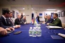 El mandatario paraguayo mantuvo unos minutos de conversación con el líder ucraniano en compañía del ministro de Relaciones Exteriores Rubén Ramírez y el titular de la cartera de Economía y Finanzas, Carlos Fernández Valdovinos, además de miembros de la comitiva nacional, para conversar sobre el asunto de los conflictos en el país de Europa del Este, quien enfrenta el asedio de las fuerzas rusas.
