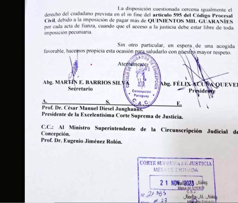 El Círculo de Abogados de Concepción había denunciado que la Corte dispuso el pago de 500.000 guaraníes a los Actuarios por hacer un acta de fianza y que esta disposición viola los derechos de los procesados. Una nota presentada en la Corte y firmada por la directiva de este círculo, Félix Acuña Quevedo (presidente) y Martin Barrios Silva (secretario) señala que «no se puede lucrar con la libertad de las personas» y tampoco «percibir sumas de dinero por actuaciones realizadas en cumplimiento de sus funciones».