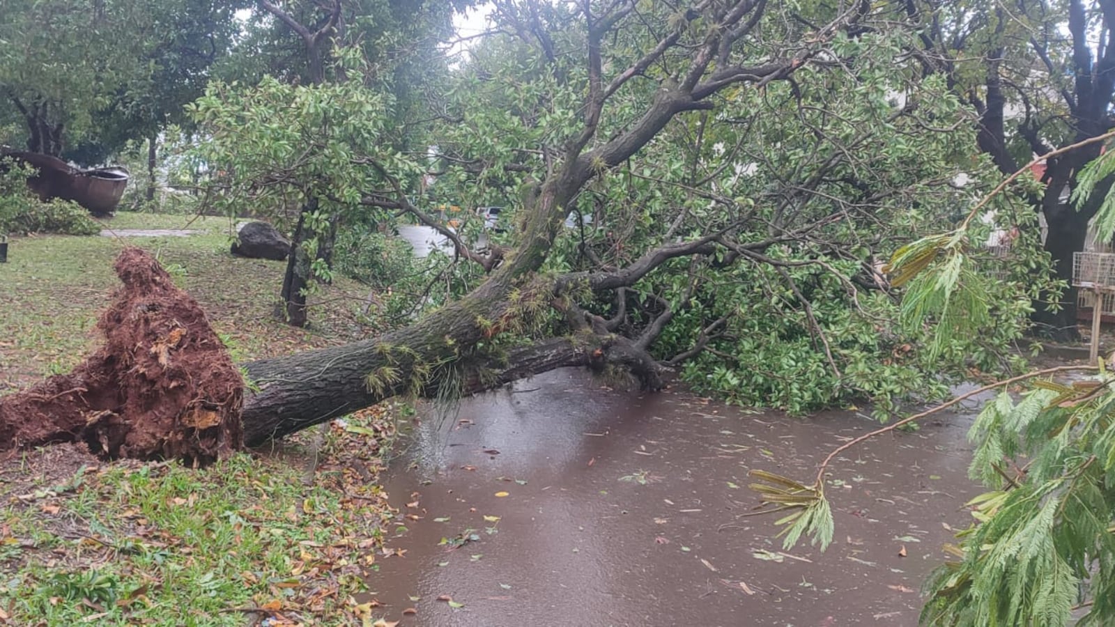 Varias calles del centro urbano de Encarnación quedaron cortadas por árboles caídos. En la ruta nacional PY01 “Mcal. Francisco Solano López”, en el barrio Las Delicias, un enorme árbol cayó sobre la calzada cubriendo totalmente el paso. Bomberos voluntarios trabajaron intensamente con motosierras para cortar el tronco y despejar la ruta.