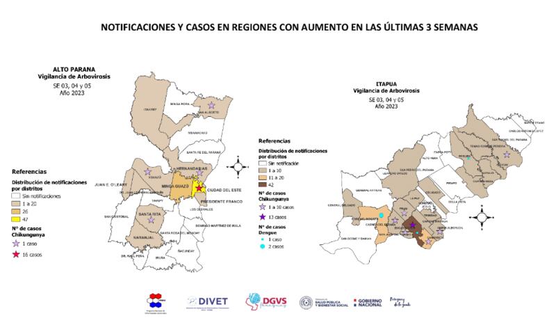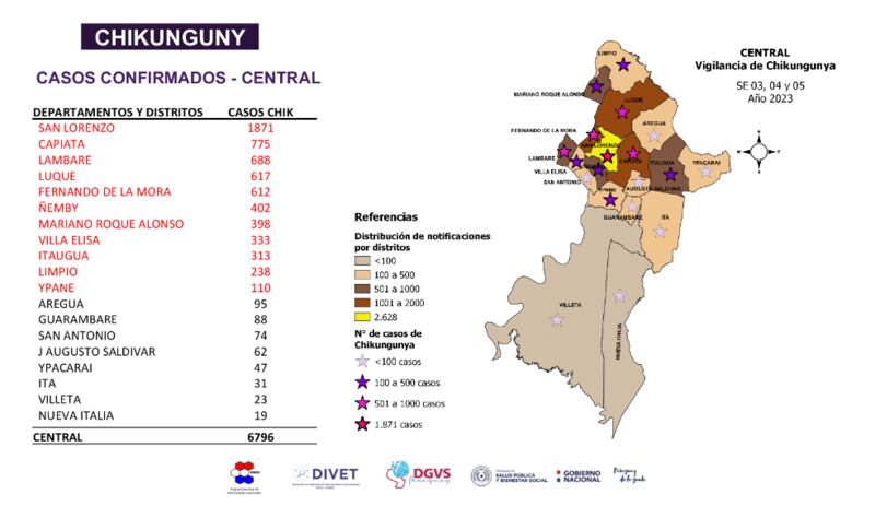 El Ministerio de Salud Pública y Bienestar Social (MSPyBS), publicó mapas detallados de las notificaciones y casos de chikungunya, principalmente en Asunción, Central, Itapúa y Alto Paraná, donde el arbovirosis se disparan de forma preocupante. Cerca de 11 mil afectados en tan sólo tres semanas marcan la dramática situación que se extiende a todo el país.