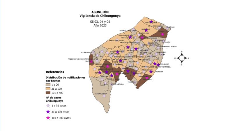 En Asunción los barrios con mayor cantidad de notificaciones son Sajonia, Loma Pytá, Trinidad, San Pablo, Nazareth, Vista Alegre, San Vicente, Obrero y Roberto L. Pettit. Los barrios con mayor cantidad de casos confirmados de chikungunya son Sajonia, Loma Pytá, Trinidad, San Pablo, San Vicente y Obrero.