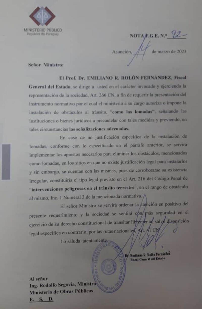 El fiscal general le recuerda al ministro al final de la nota que el Ministerio a su cargo se servirá en ordenar la atención del pedido de informe requerido a fin de salvaguardar el libre tránsito salvo disposición legal específica que diga lo contrario en todas las rutas nacionales según se menciona en el artículo 41 de la Constitución Nacional.
