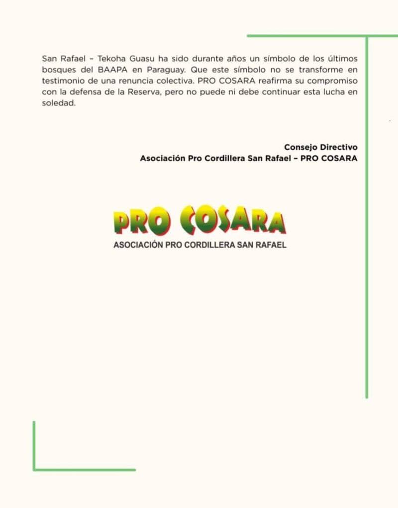 La Asociación Pro Cordillera San Rafael (Pro Cosara) advierte que la Reserva para Parque Nacional San Rafael, Tekoha Guasu, atraviesa un proceso acelerado de degradación debido a la deforestación, las invasiones y diversas actividades ilícitas. La organización solicita medidas urgentes y el estricto cumplimiento de las leyes ambientales para proteger este territorio clave.