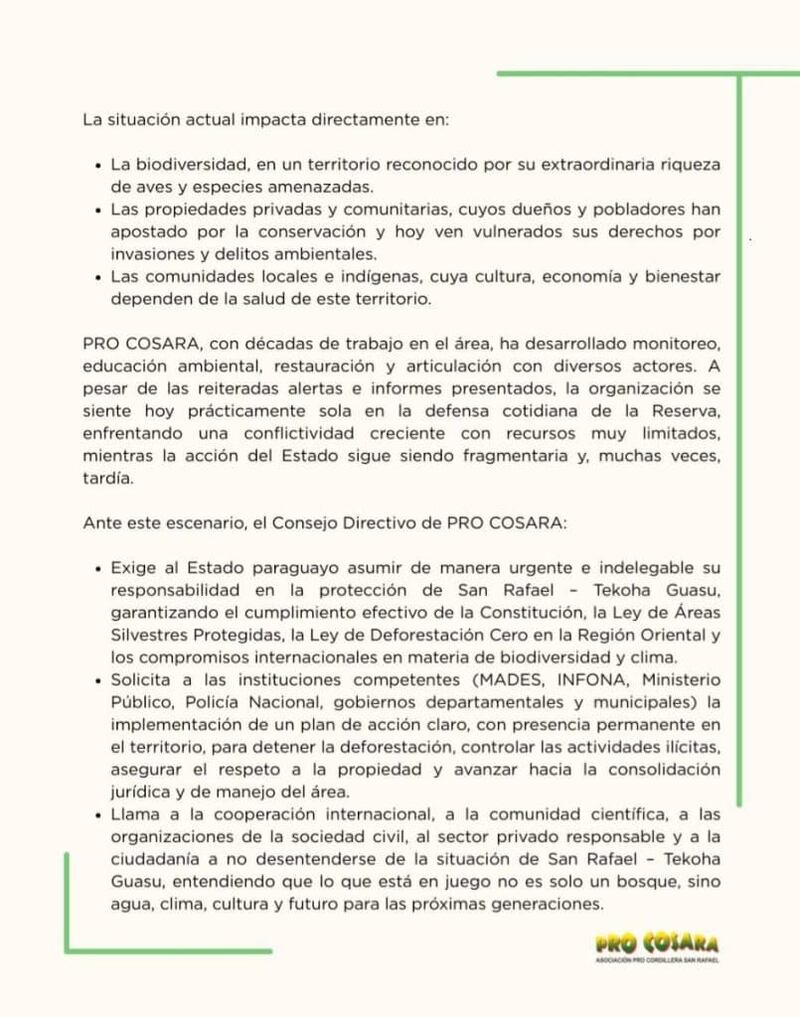 El comunicado también destaca la importancia global de San Rafael, especialmente en un contexto donde Paraguay reafirma compromisos internacionales de conservación. La situación en el terreno representa un desafío para la protección de los ecosistemas del país.