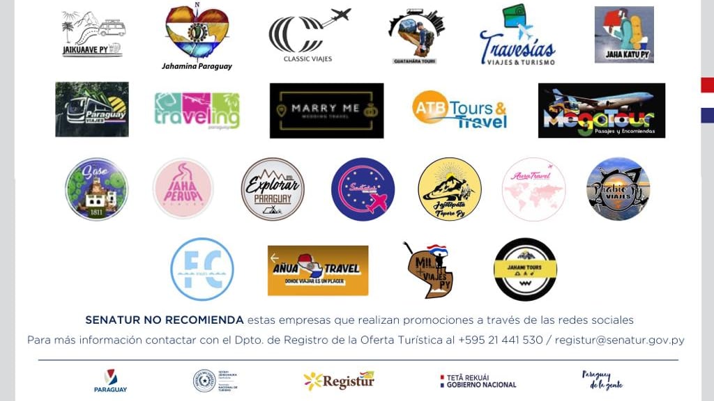 Continúa la lista Sasô 1811, Jaha Perupi, Explorar Paraguay, Santorini Travel Service, Jajotopata Tapere Py, Aura Travel, Phabio Py Viajes, FC Viajes, Añua Travel, Mil Viajes Py, además de Jahami Tours, quienes sólo se presentan en redes sociales con supuestos destinos nacionales o internacionales careciendo de registro para realizar promociones.