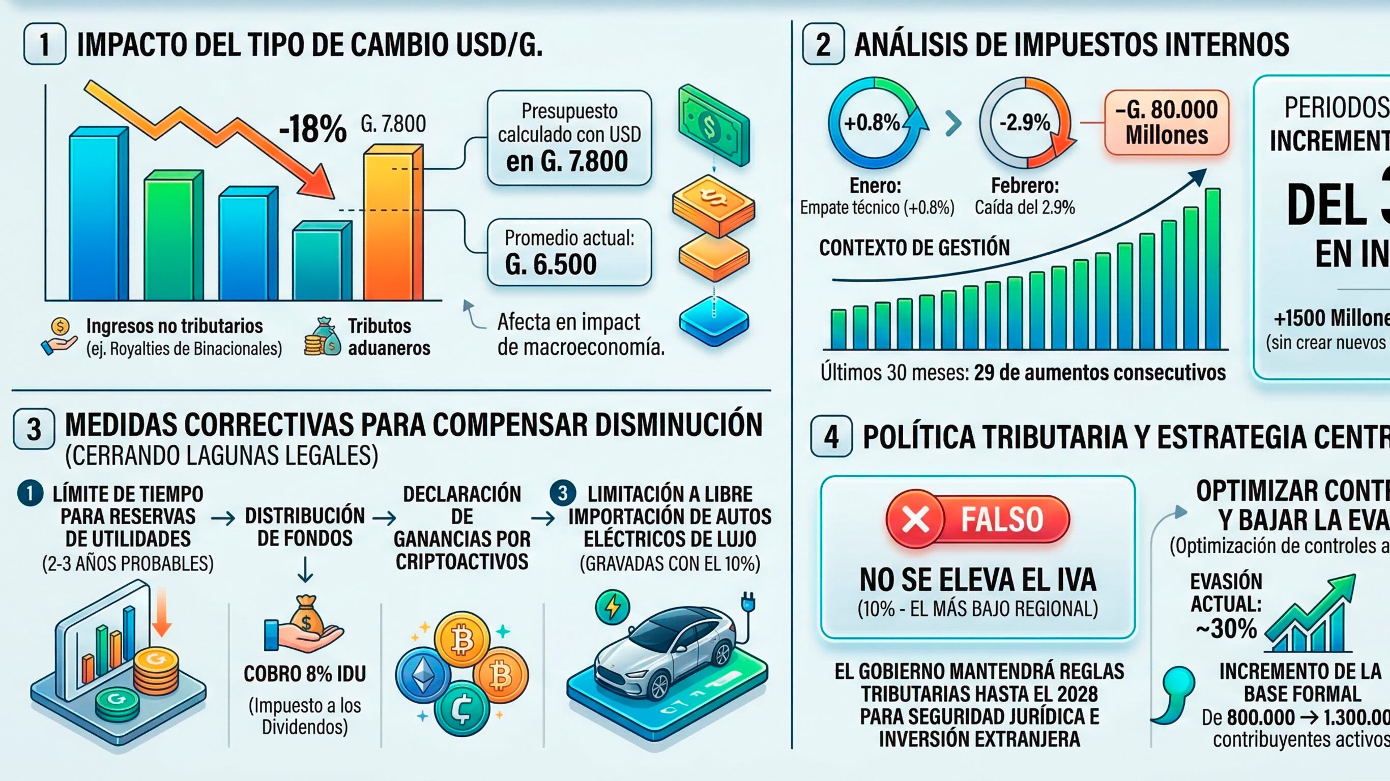 Durante una entrevista, aclaró que la merma se debe a la fuerte caída del 18% en el tipo de cambio del dólar frente al guaraní. Eso afecta directamente a los ingresos no tributarios, como los royalties de las entidades binacionales, y a los tributos aduaneros. El presupuesto (PGN) se calculó con un dólar en G. 7.800, pero actualmente promedia los G. 6.500, generando un impacto negativo en la macroeconomía paraguaya.