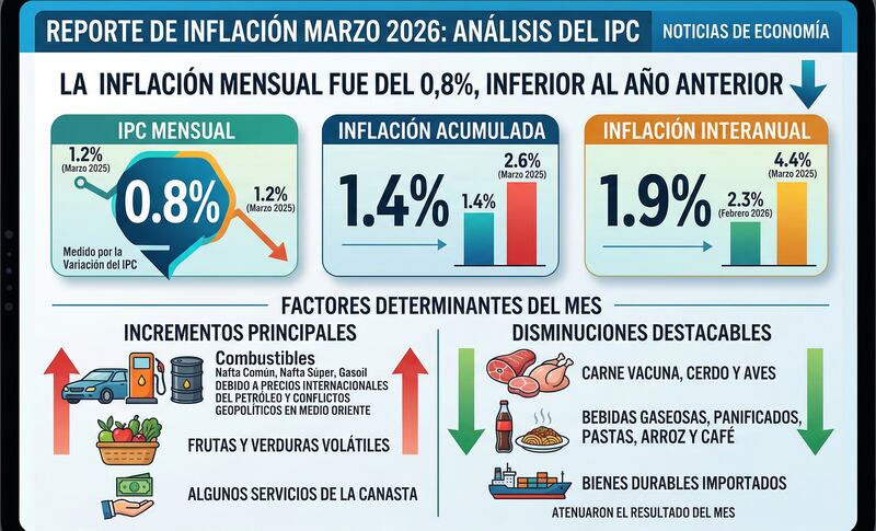 La inflación del mes de marzo de 2026, medida a través del Índice de Precios al Consumidor (IPC), registró una variación del 0,8%. Este resultado refleja una notable desaceleración si se lo compara con el 1,2% observado en el mismo mes del año 2025.