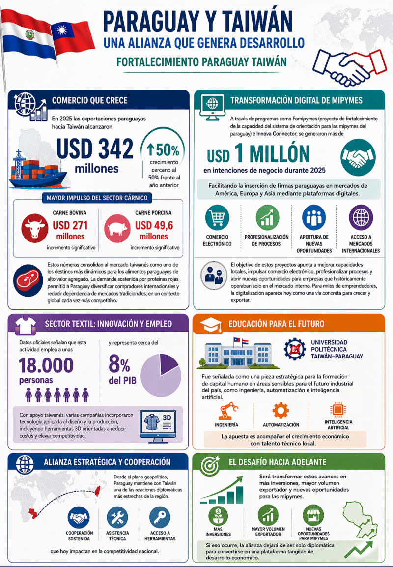 Desde el plano geopolítico, Paraguay mantiene con Taiwán una de las relaciones diplomáticas más estrechas de la región. Esa cercanía se tradujo en cooperación sostenida, asistencia técnica y acceso a herramientas que hoy impactan en la competitividad nacional.