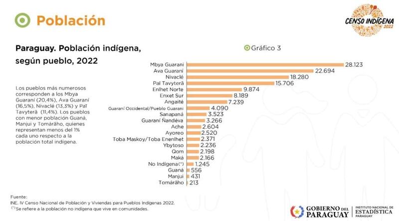 Los pueblos indígenas más numerosos son los Mbya Guaraní, seguido de Avá Guaraní, Nivaclé y Paí Tavyterá. También hay pueblos indígenas con menor población. Ver cuadro de abajo: