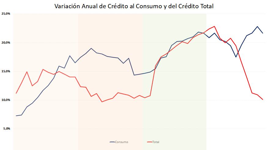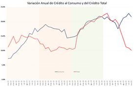 Lo más importante para la lectura coyuntural es el desacople en el 2025: el crédito total se desacelera con fuerza (a 10% interanual en nov-2025), mientras el consumo mantiene tasas cercanas a 22% interanual. En otras palabras: cuando el ciclo pierde impulso en el agregado, el consumo sigue traccionando.