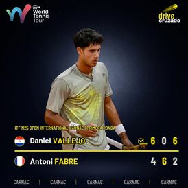 El número uno del tenis profesional de nuestro país, Adolfo Daniel Vallejo Alvarez, postergó su partido de segunda ronda de single, previsto para hoy, debido a la lluvia, pero ya en un campo auxiliar bajo techo, se reprogramó el doble en el que así como ayer hoy también triunfó en Carnac, Francia.