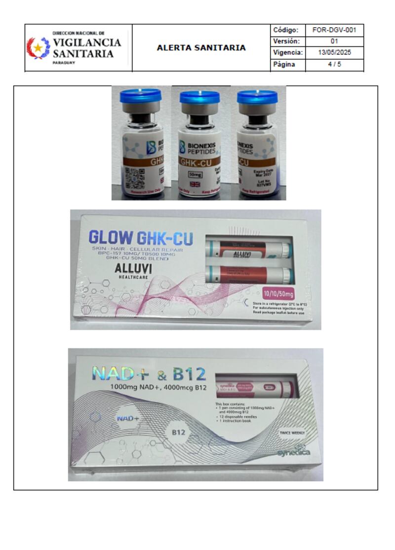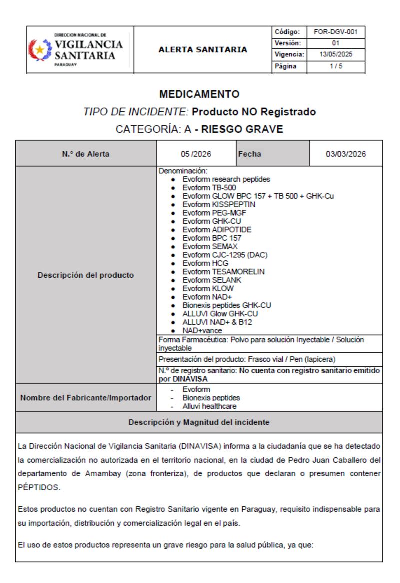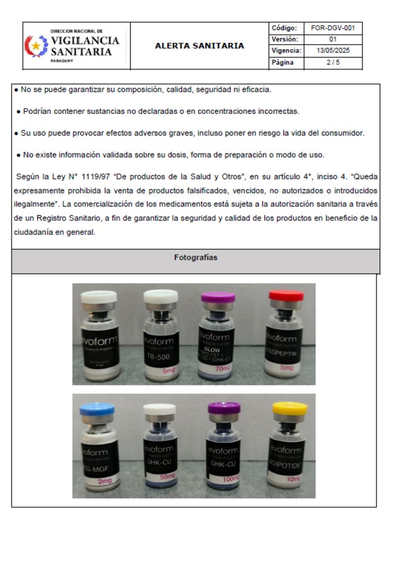 Los artículos incautados declaran o presumen contener péptidos, moléculas formadas por la unión de aminoácidos y se encontraban a la venta sin contar con el Registro Sanitario vigente en Paraguay, un requisito legal indispensable para su importación, distribución y comercialización.