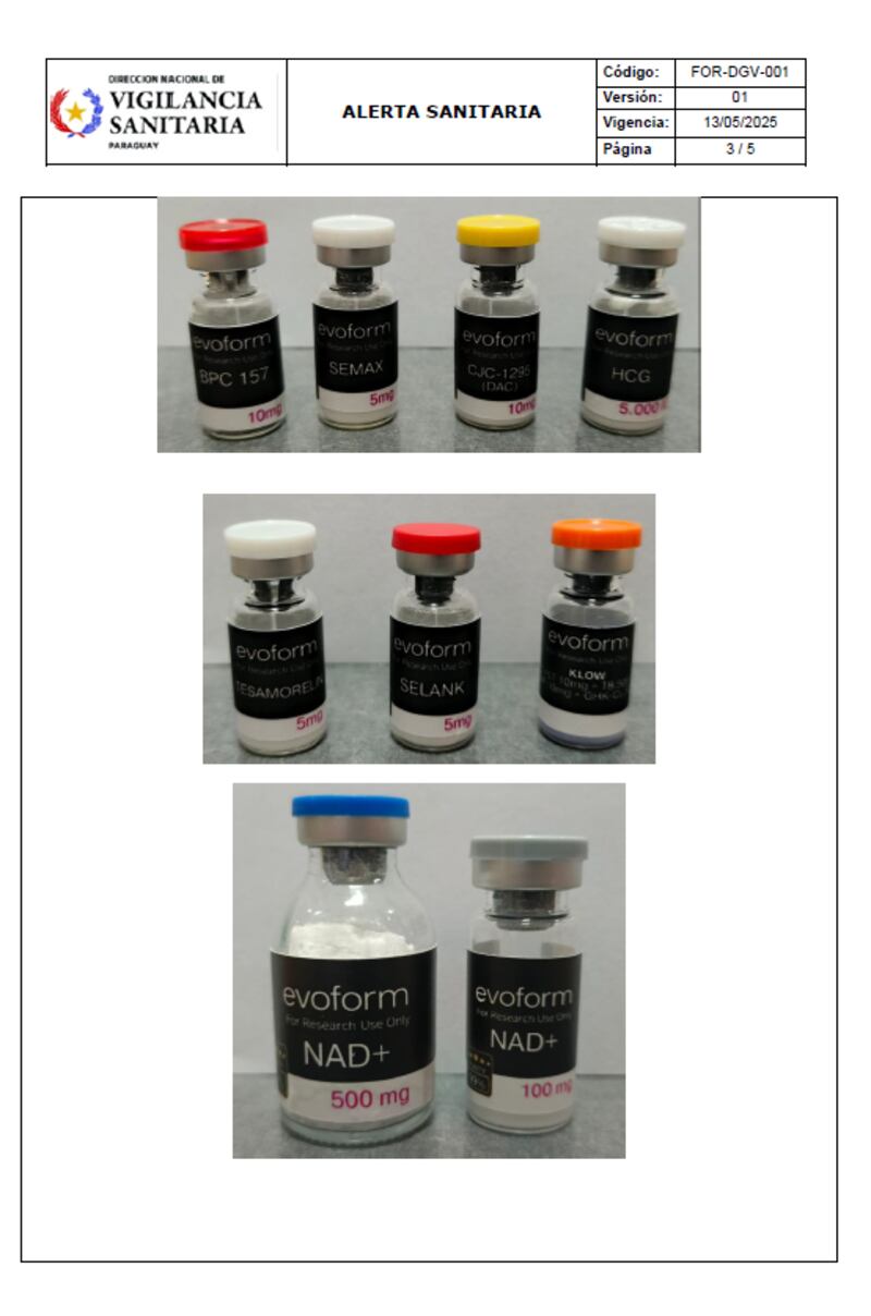 Según el reporte oficial, los productos irregulares se presentan en formato de polvo para solución inyectable, distribuidos en frascos viales o en formato de lapicera. Entre la lista de los 18 artículos decomisados destacan varias presentaciones bajo la denominación Evoform, tales como: