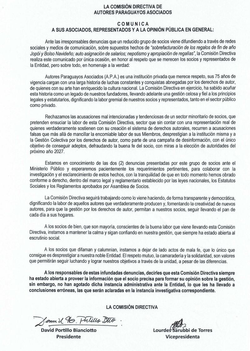 A través de un comunicado emitido “por única vez”, la Comisión Directiva de Autores Paraguayos Asociados (A.P.A.) salió al paso de las acusaciones difundidas recientemente en redes sociales y medios de comunicación por un grupo de socios de la entidad.