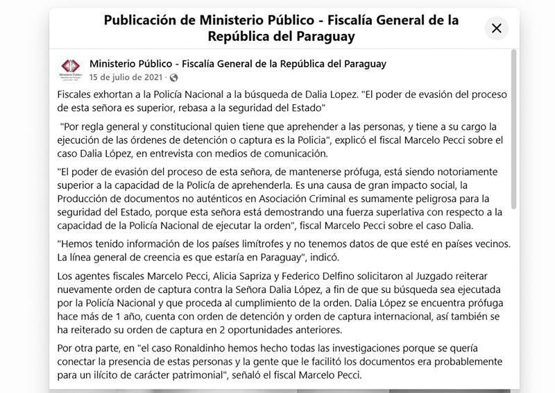 En el 2021, Pecci advirtió que la capacidad de esconderse de Dalia López era mayor a la de la Policía y que por eso los agentes no podían encontrarla. Así fue que siguió prófuga hasta que terminó el gobierno de Mario Abdo Benítez. Recién durante el gobierno actual fue detenida.